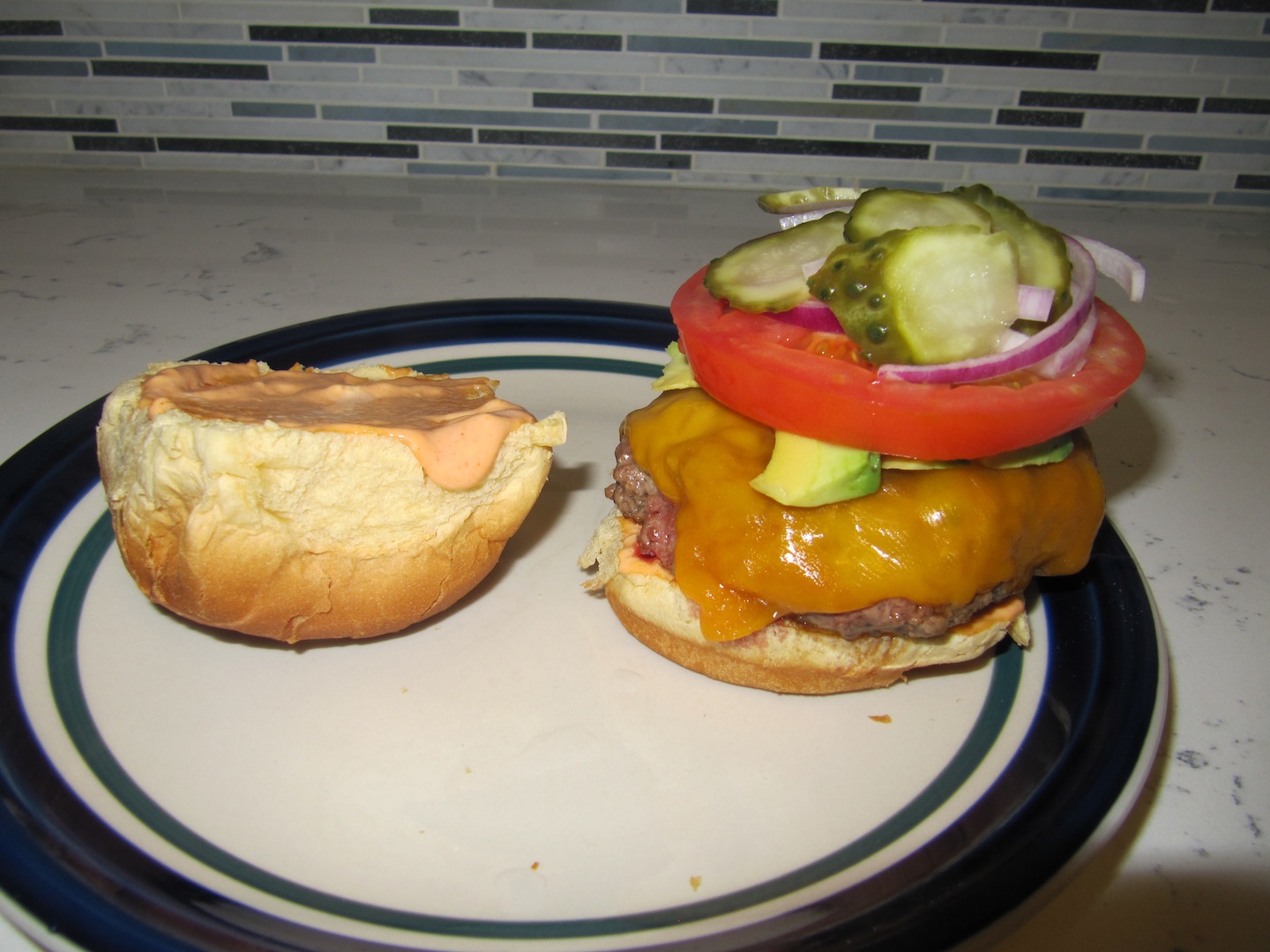 Burgers with Sriracha Mayo (makes 2 giant burgers) 1 pound ground beef beefsteak tomato 1 pickle red onion cheddar cheese 1/2 an avocado 2 potato buns 3 tablespoons mayonnaise 1 tablespoon Sriracha 1 tablespoon ketchup Mix up the mayo, Sriracha and ketchup. Season the beef with salt and pepper, and form into two giant patties. Or use less beef if you'd prefer smaller patties. Make an indentation in the middle of each burger (all the burger pros say to do this so your burger will be nice and flat and toppings will not just roll off of it). Cook your burger on a fancy grill pan, so it will have lovely grill lines. I cooked ours for 3 1/2 minutes on each side and then added a slice of cheddar and cooked it for another minute. Our burgers were way too rare so I would recommend to cook yours for a little longer if you are making giant burgers.