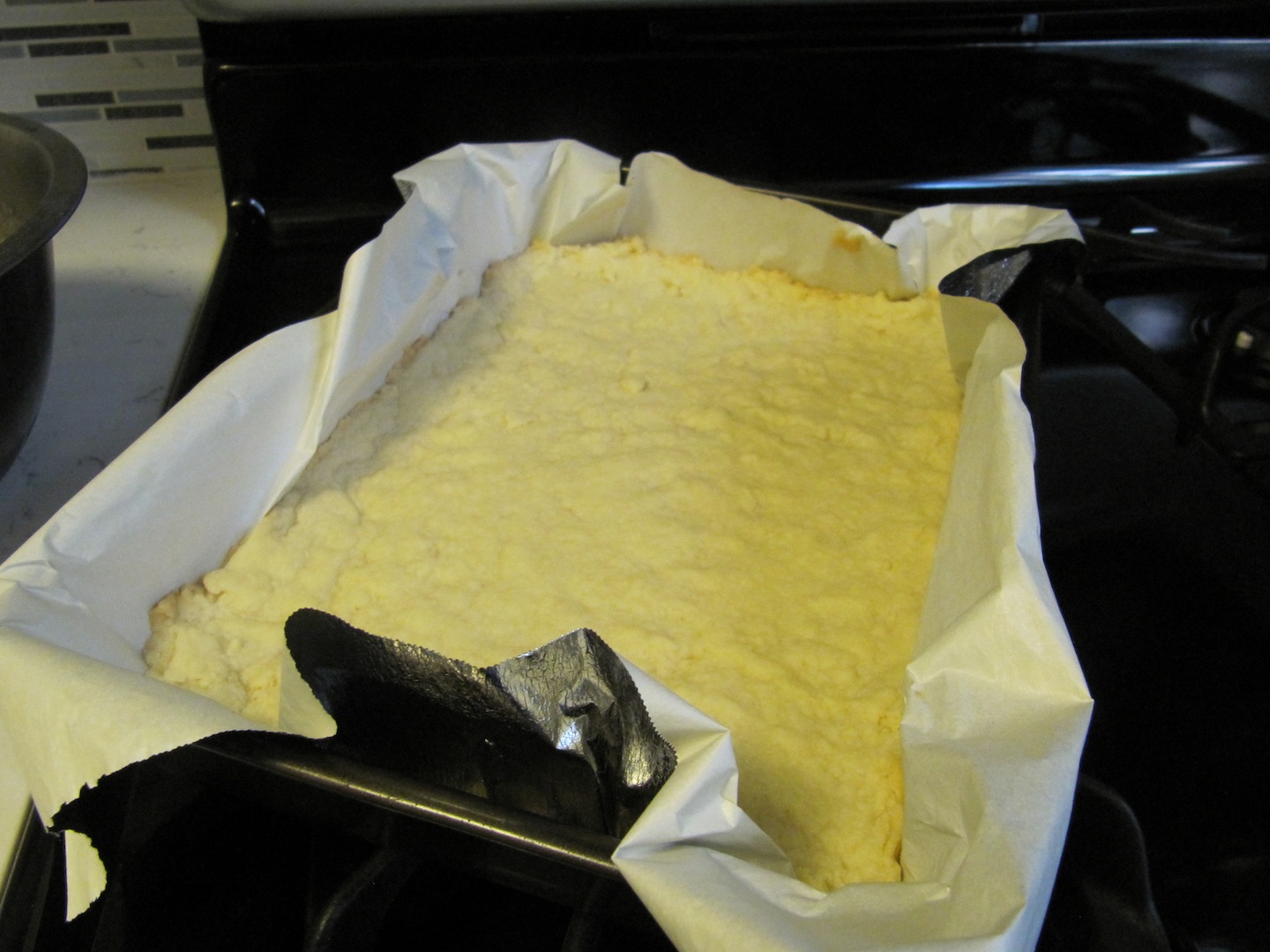 First line a 9" by 13" by 2" baking pan with parchment paper. This is so your bars don't get stuck. Leave an overhang on all sides.