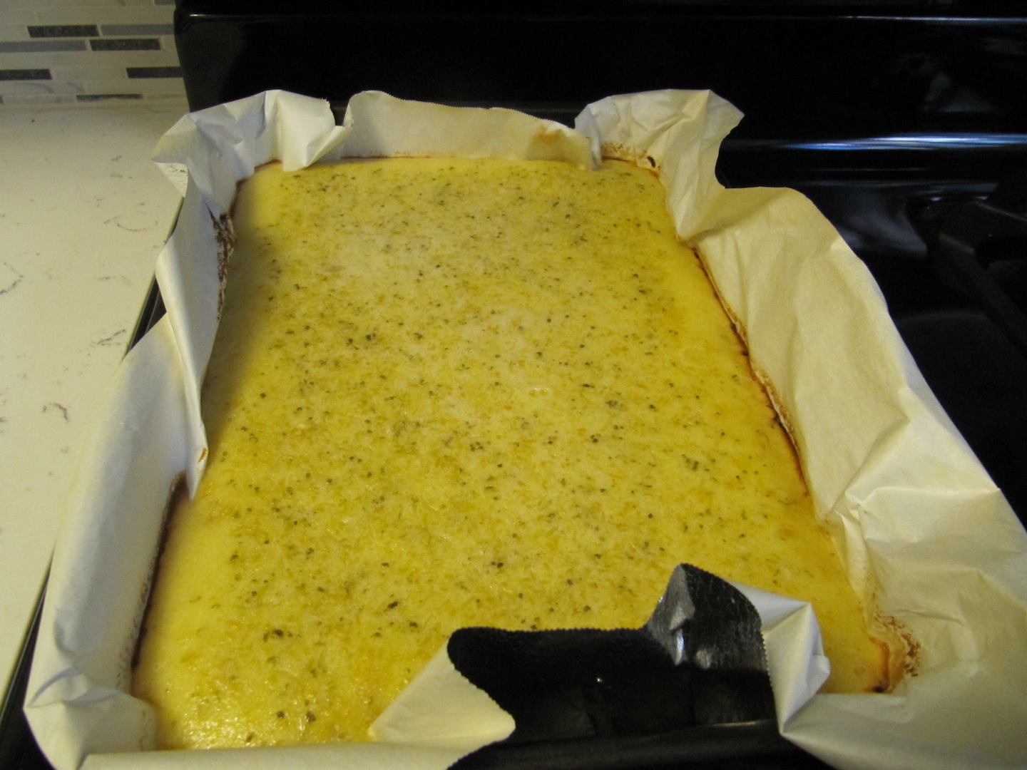 After it's cool, use the parchment paper overhang to remove the bars from the baking pan. Then dust some powdered sugar and slice it into bars!